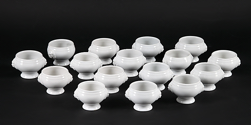 Bauchiger Gefäßkörper auf eingezogener Standfläche. Auf der Leibung zwei gegenständige Löwenkopfreliefs. Weißporzellan. H 5,5 cm.