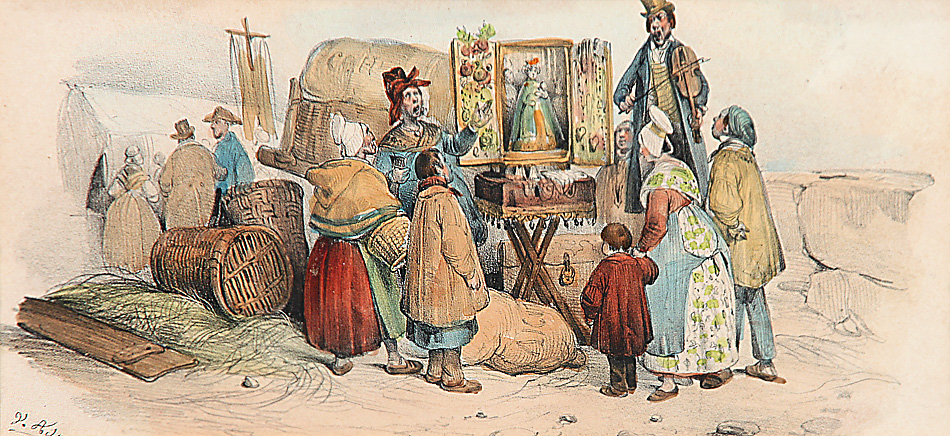 „Genreszene“. Col. Lithografie um 1830. Li. u. im Stein sign. V. Adam. 10,4 x 21,2 cm. Passepartout, vergl. R..
