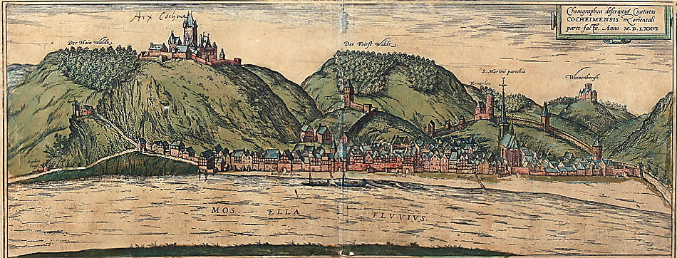 „Cochem“. Gesamtansicht. Aus Braun und Hogenberg, 1576. 15,7 x 41,4 cm. Bl. gebräunt, im Randbereich stellenweise etwas knitterig, unten an der Mittenfalz kleinere Beschädigung. Passepartout, vergl. R..