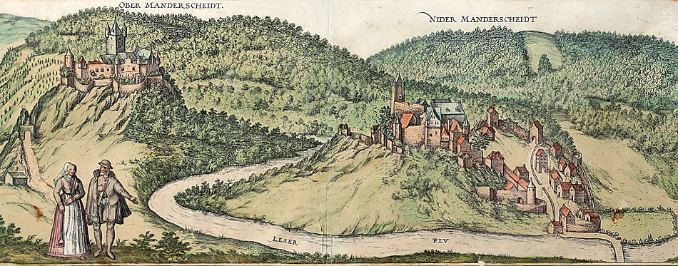 „Ober Manderscheidt Nider Manderscheidt“. Aus Braun und Hogenberg, 1598. 16 x 44 cm. Unten neben der Mittenfalz kleinerer Riss, unten rechts am Bildrand kleine Beschädigung. Passepartout, vergl. R..
