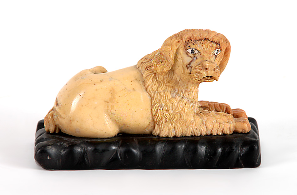 In Form eines sitzendliegenden Hundes aus hellbraunem, polierten Speckstein auf einem dunkelgrauen Steinsockel. H 8,7 cm, L 14,3 cm, B 6,4 cm.