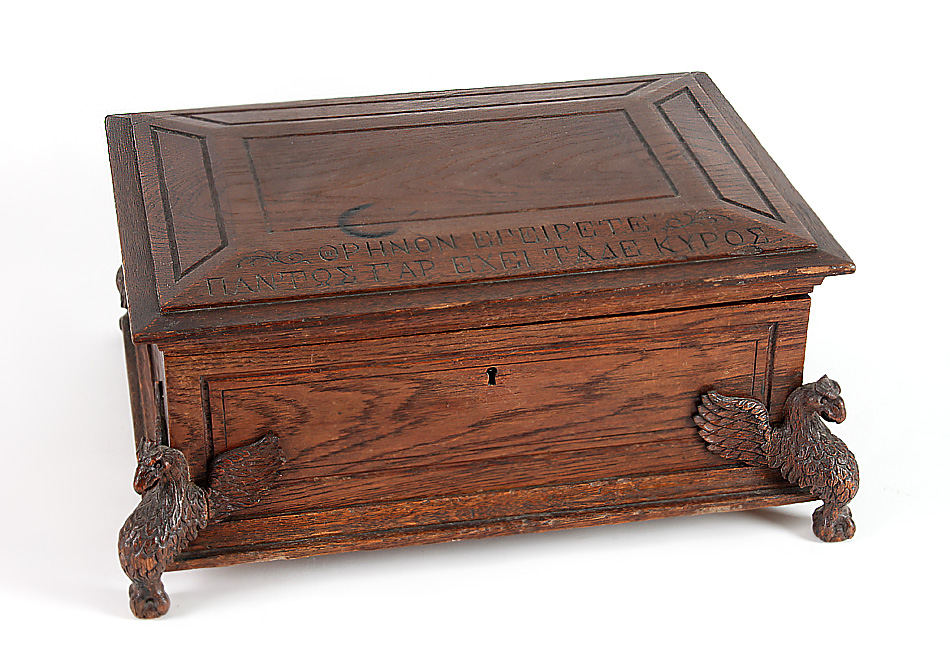 Eiche, braun gebeizt. Auf den vier Ecken ein geschnitzter, plastischer Adler. Deckel mit eingekerbter Inschrift in griechischer Sprache, übersetzt: „Trauer erweckt in jedem Fall, denn dies hat Macht“. Im Boden eingekerbt: „H. Stephan, Eberswalde 1887“. Mit Schloss, der Schlüssel fehlt. Alters- und Gebrauchsspuren. L 44,5 cm, B 33,3 cm, H 19,5 cm.