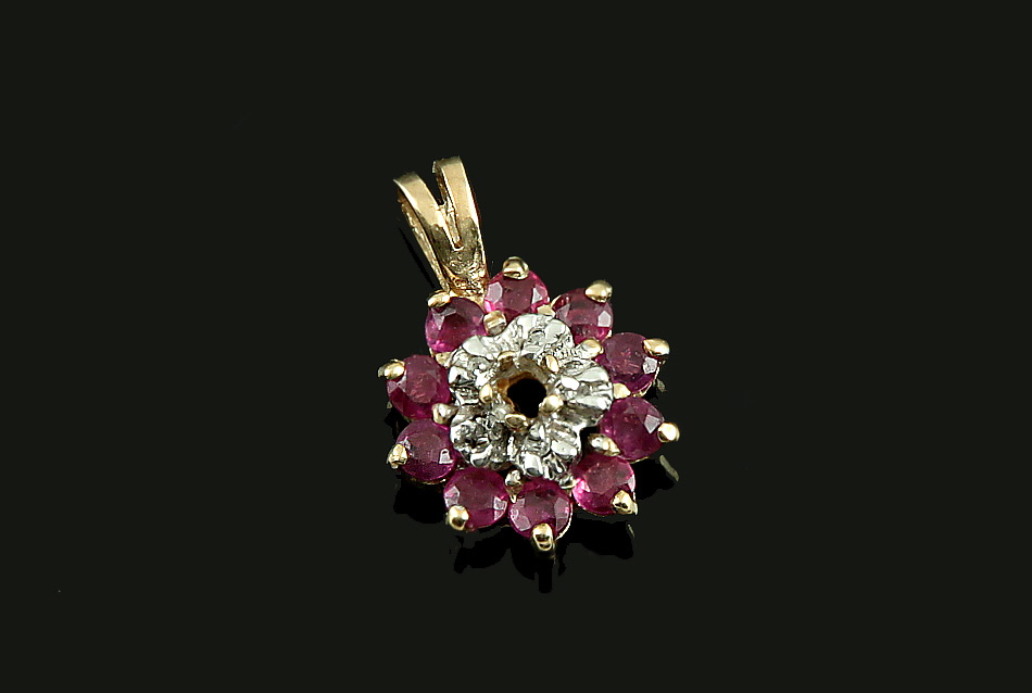 GG 8 ct (geprüft). Blütenform mit Rubinen und Zirkonia. L ca. 1,6 cm. 1,2 g brutto.