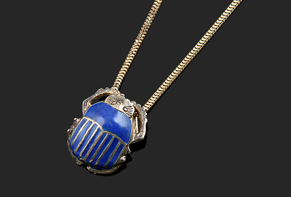 835er und 925er Silber vergoldet. Anhänger in Form eines blau emaillierten Skarabäus. L ca. 2,2 cm. Schlangengliederkette mit Ringösenschließe. Zus. 20,5 g brutto.