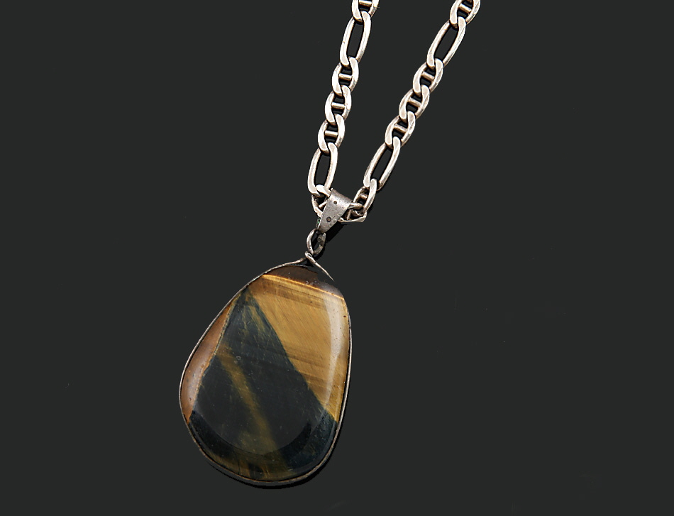 Asymetrischer Anhänger aus Tigerauge. L ca. 4,8 cm. Gliederkette mit Karabinerhakenschließe 925er Silber.