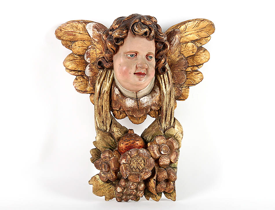 „Putto mit Früchten und Blumen“. Holz geschnitzt, Rückseite abgeflacht. Farbfassung und Vergoldung. H 36,5 cm.