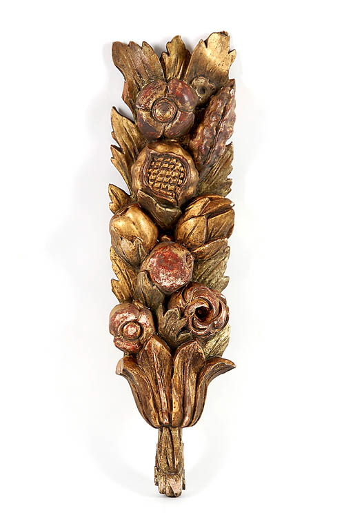 Zierelement aus Früchten und Blumen. Holz geschnitzt, Rückseite abgeflacht. Goldfassung. Mehrere kleinere Beschädigungen. H 55,5 cm.