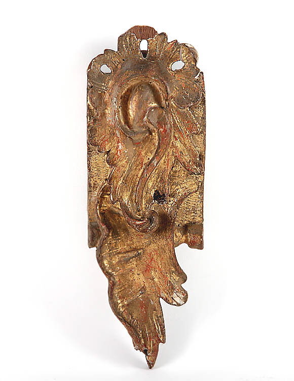 Applik aus Akanthus und Rocaille. Eiche geschnitzt, Goldfassung. Oben und unten etwas fehlende Substanz. H 29 cm.