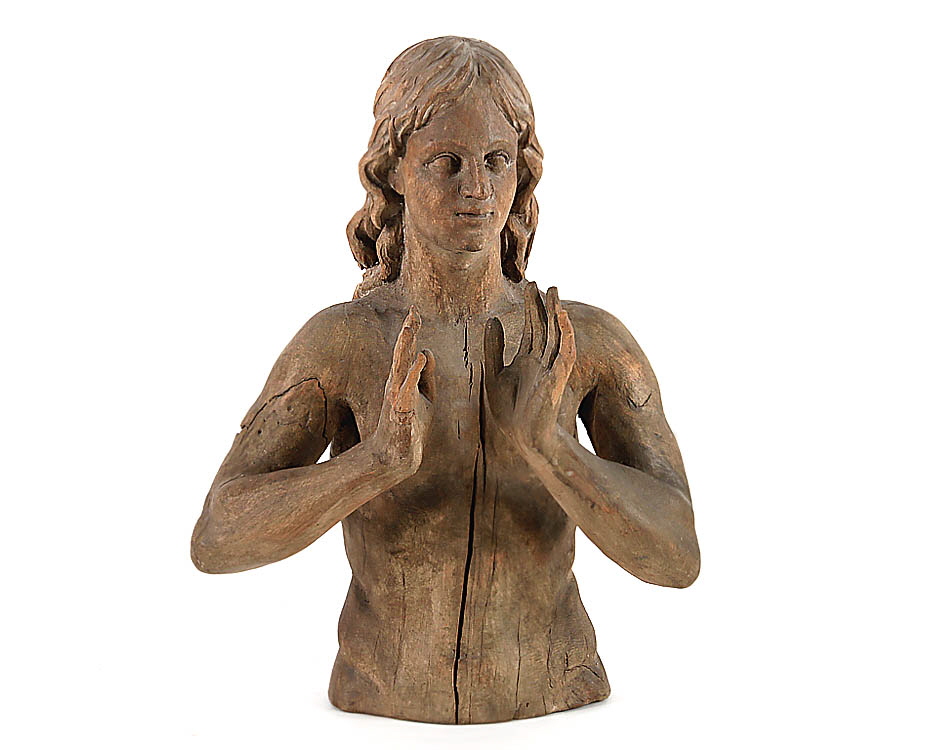 „Männliche Halbfigur mit erhobenen Händen“. Holz geschnitzt, grau-braune Patina. Mehrere Altersrisse. H 40,5 cm.
