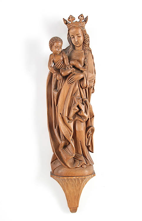 „Gekrönte Madonna mit Jesuskind“. Holz geschnitzt, hellbraun patiniert, verso abgeflacht und gehöhlt. Krone etwas besch.. H 80,5 cm.