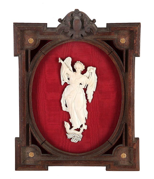 Frankreich, Ende 18. Jh.. „Siegesgöttin Nike“. Flachrelief aus Elfenbein. H 15,5 cm. Mehrere kleine Fehlstellen. Auf dunkelrotem Moiré montiert, in geschnitztem, barocken Nussholzrahmen. Verso auf dem Rahmenkarton aufgeklebter Kupferstich mit Brustbildnis des polnischen Schriftstellers und Aufklärers Ignacy Krasicki (1735-1801). Das Flachrelief zeigt die Siegesgöttin Nike und steht im Zusammenhang mit der Tragödie „Irene“ von Voltaire. Den unteren Abschluss des Reliefs bilden zwei Schriftbänder, die eine direkte Datierung der Figur liefern. Die eingeritzte Jahreszahl 1779 bezieht sich auf das posthume Erscheinungsdatum von Voltaires (1694-1778) letzter Tragödie „Irene“ in Buchform in Paris. Das zweite Schriftband lautet „Irene tragedi(e) an 5 aetis“. Das Relief wurde somit wohl anlässlich des 5-jährigen Erscheinens dieser Tragödie Voltaires 1784 angefertigt. Anm.: CITES-Bescheinigung, ausgestellt in Köln am 14.05.2025, liegt vor. Provenienz: ehem. Sammlung des Grafen Ignacy Krasicki, jetzt: deutscher Privatbesitz.
