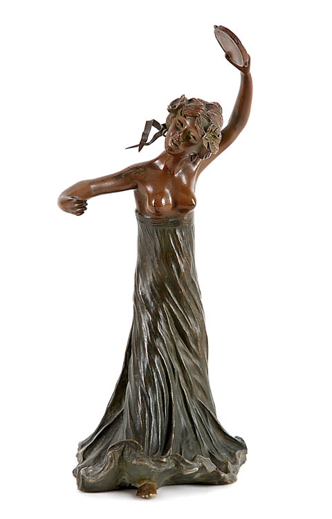 Frankreich, wohl Paris, um 1900. „Tänzerin mit Tamburin“. Bronze, braune und grüne Patina. H 27,3 cm.