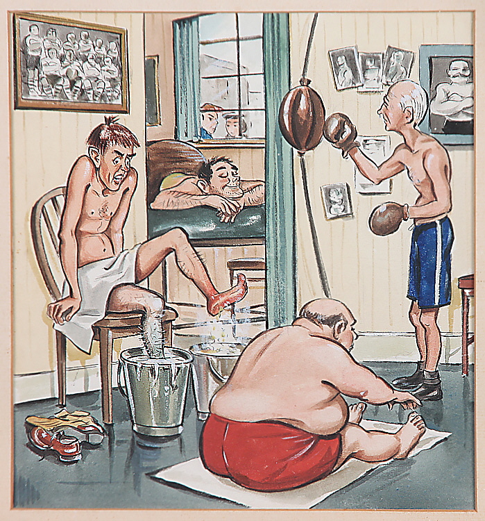 „Humoristische Szene in einem Sportstudio“. Aquarell/Papier, ca. 25 x 23,5 cm (Bildausschnitt). Passepartout, vergl. R..