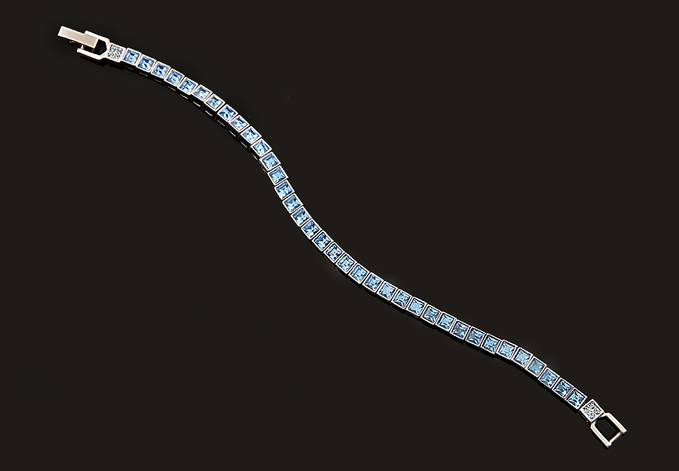 Swarovski. Silberfarbenes Metall, facettiertes Kristallglas hellblau und farbl.. Leiterschließe. L ca. 17,8 cm.