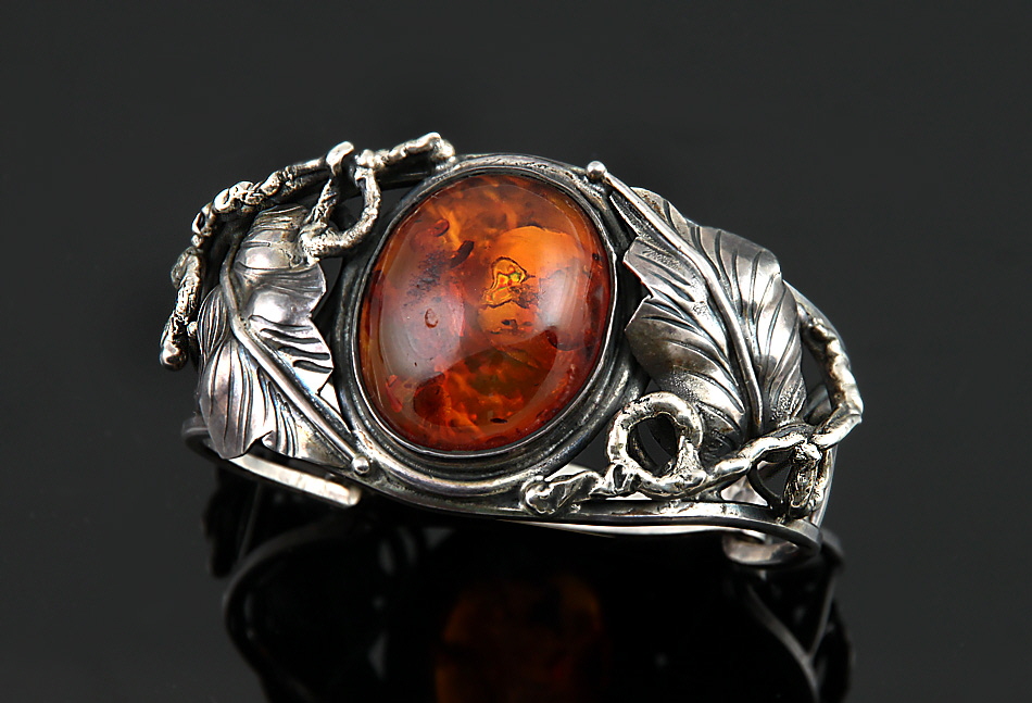 925er Silber. Zierdurchbrüche, Rankenzier mit Blattwerk, mittig großer Bernsteincabochon. Hakenschließe. D innen ca. 57 mm. 50 g brutto.