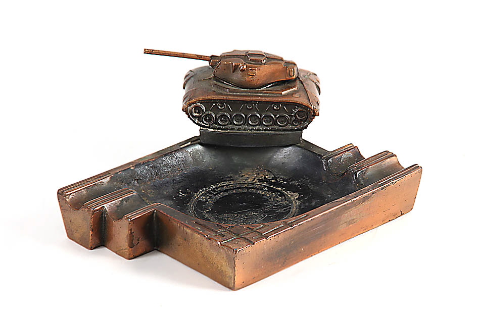 Ca. 1940er Jahre. Grauguss, bronzepatiniert. Dekoriert mit einem Kampfpanzer. Im Boden Rundrelief mit Häusern und Beschriftung: FALLINGBOSTEL LÜNEBURGER HEIDE. H ca. 5 cm, L ca. 10,5 cm, B ca. 9,2 cm.