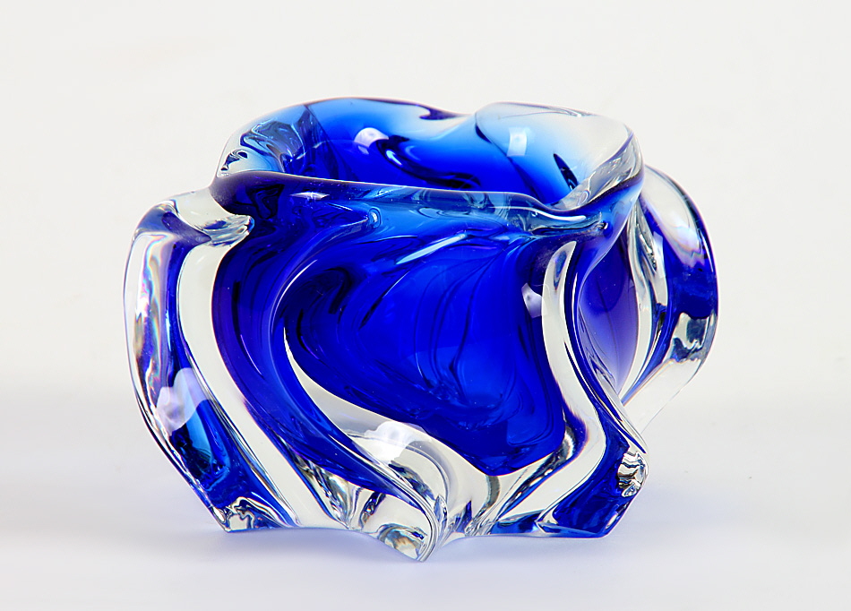 Italien, Murano. Runde, bauchige Form mit geschwungenem Rippendekor, sternförmige Standfläche. Farbl. und kobaltblaues Überfangglas. H 8,8 cm, D oben 10 cm.