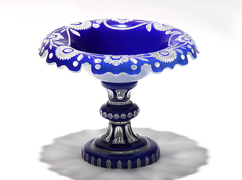 Böhmen, wohl um 1900. Runde, bauchige Form, geschweifter Rand, Balusterschaft auf gewölbtem Profilfuß. Farbl. Glas mit weißem und blauem Überfang. Feiner Schliffdekor, auf der Fahne umlaufende Blumenranke. H 14,3 cm, D 18,5 cm. Im Spiegel eine an der Oberfläche geöffnete Luftblase.