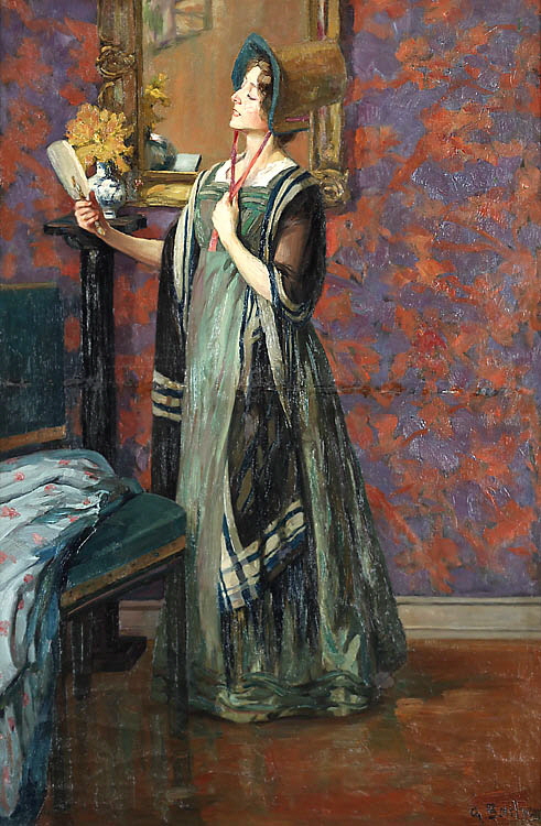 „Junge Frau im Interieur vor einem Spiegel einen Hut probierend“. Re. u. sign. G. Bachem. Öl/Lwd., 105,5 x 70 cm. R.. Hinweis: nur Selbstabholung oder Versand mit Spedition.