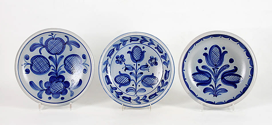 Drei Teller. 1960er Jahre. Bauchige Form. Salzglasiertes Steinzeug, handgedreht, blaue Bemalung. D 27,5 cm, 28,5 cm.