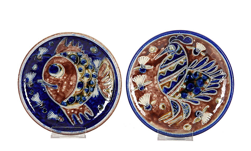 1904 Bendorf – 1983 Höhr-Grenzhausen; deut. Keramikerin und Kunsthandwerkerin. Zwei Teller. 1960er Jahre. Sign. Balzar-Kopp. Salzglasiertes Steinzeug, Knibis- und Reddekor, Bemalung blau und manganviolett. D 17,8 cm, 18,4 cm.