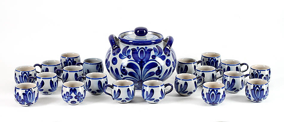 Bowlenservice: Topf, 20 Becher (12 mit Henkel). Anfang 1980er Jahre. Sign. Balzar-Kopp und B.K.. Salzglasiertes Steinzeug, handgedreht, Bemalung grau-blaue Smalte. Topf: H 22,5 cm, D oben 17 cm, Becher: H 7,2 cm.