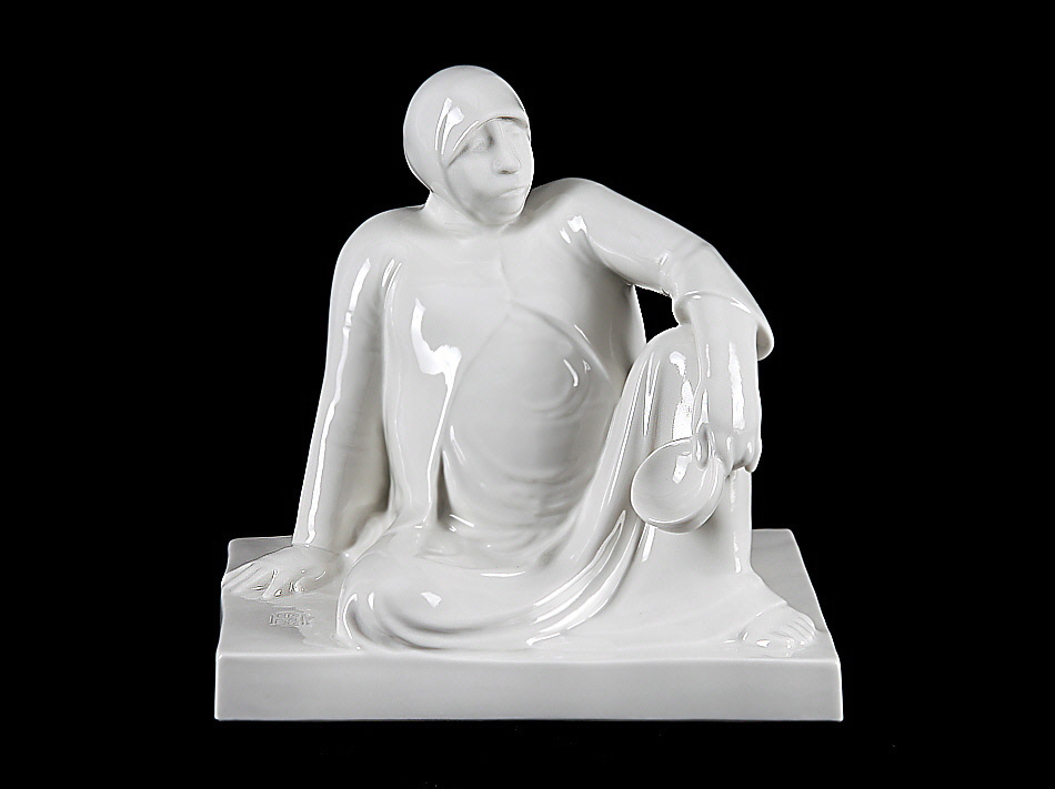 1870 Wedel/Holstein – 1938 Rostock; deut. Grafiker und Bildhauer. Schüler der Gewerbeschule in Hamburg. Studium der Bildhauerei an der Dresdener Akad.. „Russische Bettlerin“. Ausführung: Schwarzburger Werkstätten für Porzellankunst, Pressmarke mit schnürendem Fuchs, Modellnr. U 62, darunter Pressmonogramm AH. Auf dem Sockel bez.: E Barlach. Weiße, glänzende Glasur. H 25 cm, L 25,5 cm, B 19,5 cm.