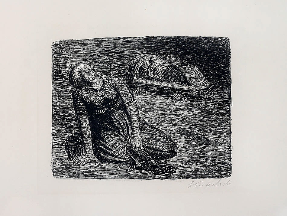 1870 Wedel/Holstein – 1938 Rostock; deut. Grafiker und Bildhauer. Schüler der Gewerbeschule in Hamburg. Studium der Bildhauerei an der Dresdener Akad.. „Der Blutflecken, aus: Der tote Tag“. 1912. Lithografie, re. u. handsign. EBarlach. 20,7 x 25,8 cm, Bl. 46 x 62 cm. Bl. mäßig gebräunt, helle Bl.Ecken. Vergl. R..