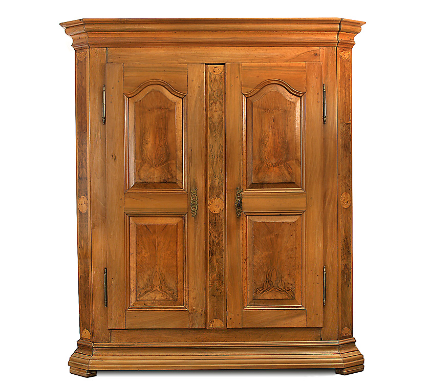 Frankreich(?), um 1800. Nussbaum massiv und furniert. Zwei Türen mit profilierten Füllungen, orig. Messingbeschläge, Eisenschloss und Schlüssel. Abgeschrägte Vorderecken, breite, profilierte Sockelleiste, breites Profilgesims. Innenausstattung fehlt. H 208 cm, B 181 cm, T 66 cm. Zustand C (partiell alter Wurmbefall, kleinere Bestoßungen).