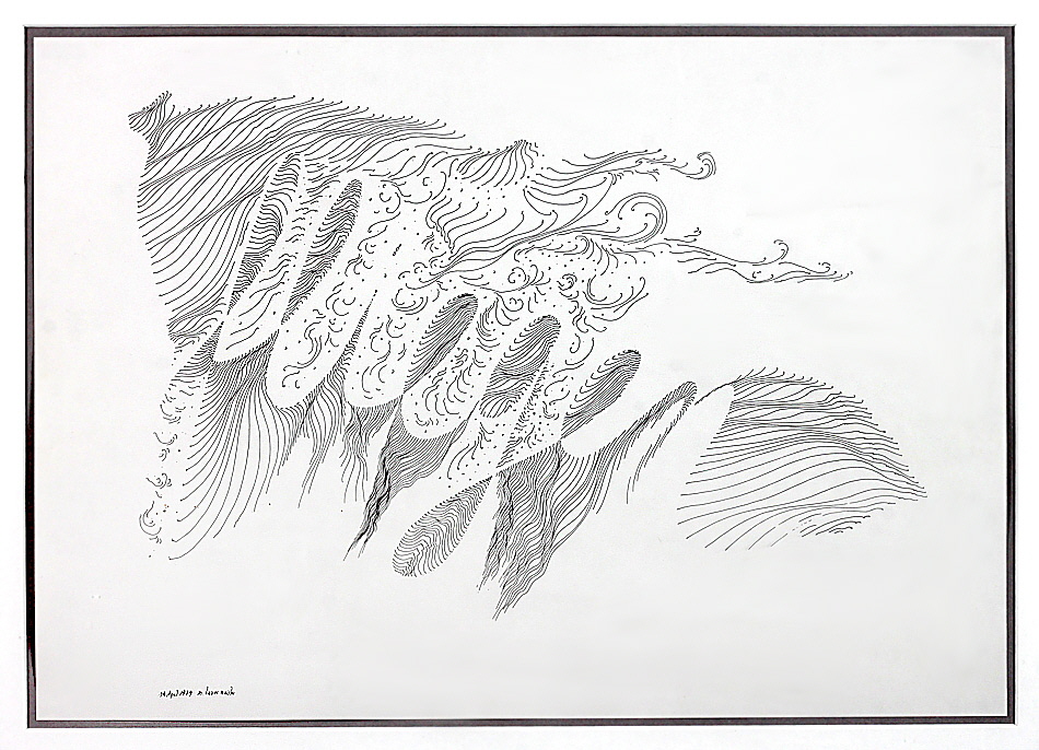 1934 Frankfurt a. M. – 2023 Bergisch Gladbach; deut. Malerin und Grafikerin. Studium an der Hochschule für Gestaltung in Ulm bei Max Bill und Helene Nonné-Schmidt, an der Staatl. Schule für Kunst und Handwerk in Saarbrücken bei Otto Steinert. „Ohne Titel“. Druck nach einer Federzeichnung von 1979. Li. u. im Druck bez. M. Bauermeister, dat. 14. April 1979. Bl. 29,9 x 42,7 cm. Vergl. R..