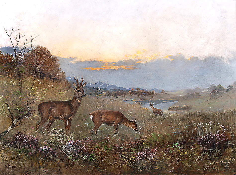 1862 München 1942; deut. Jagd- und Tiermaler. „Rehwild in der Abenddämmerung“. Li. u. sign. G. Berger. Öl/Lwd., 58,5 x 78,5 cm. R..