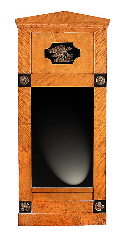 Deutsch, um 1820. Birke furniert. Gegliederte Front mit Appliken aus geprägtem Messingblech. Auf den Seiten vier Rosetten, oben auf ebonisiertem Feld ein Adler mit Pfeil und Lorbeer. Stufiger Spitzgiebel. Spiegelglas nicht mehr orig.. H 157 cm, B 68,5 cm. Zustand B/C.