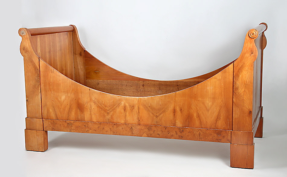Deutsch, 1. Hälfte 19. Jh.. Kirsche massiv und furniert, Eiche. Kopf- und Fußende oben eingerollt, Seitenteile konkav geschwungen. Einlegerahmen und Matratzenauflage fehlen. L 161 cm, B 93 cm, H 103,5 cm. Zustand C (mehrere kleinere Bestoßungen, eine geschnitzte Rundapplik fehlt, Kopf- und Fußteil im Randbereich etwas verworfen).