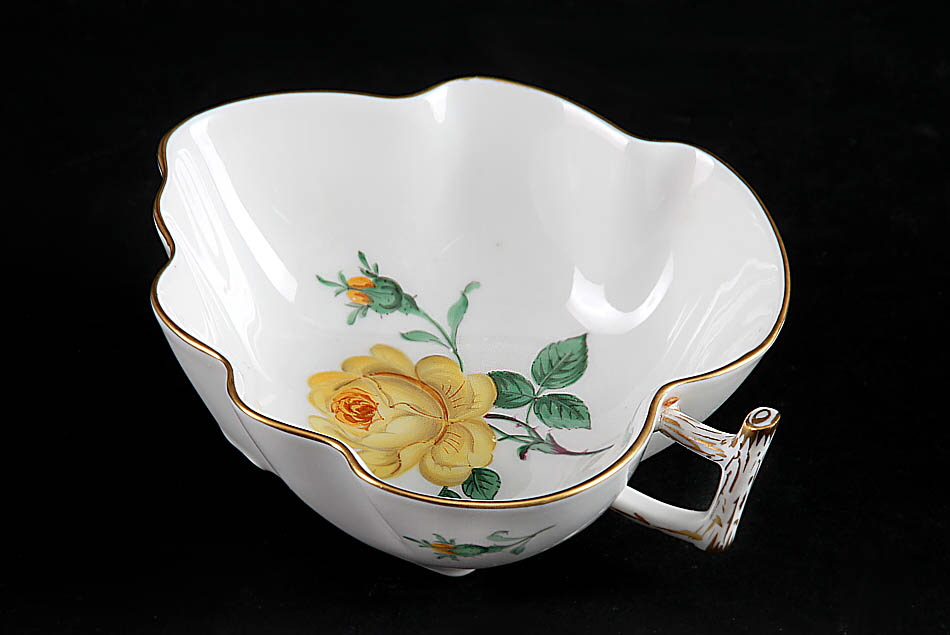 Meissen, blaue Schwertermarke, nach 1945. Dekor gelbe Rose, Golddekor. H 5 cm, L 12,9 cm.