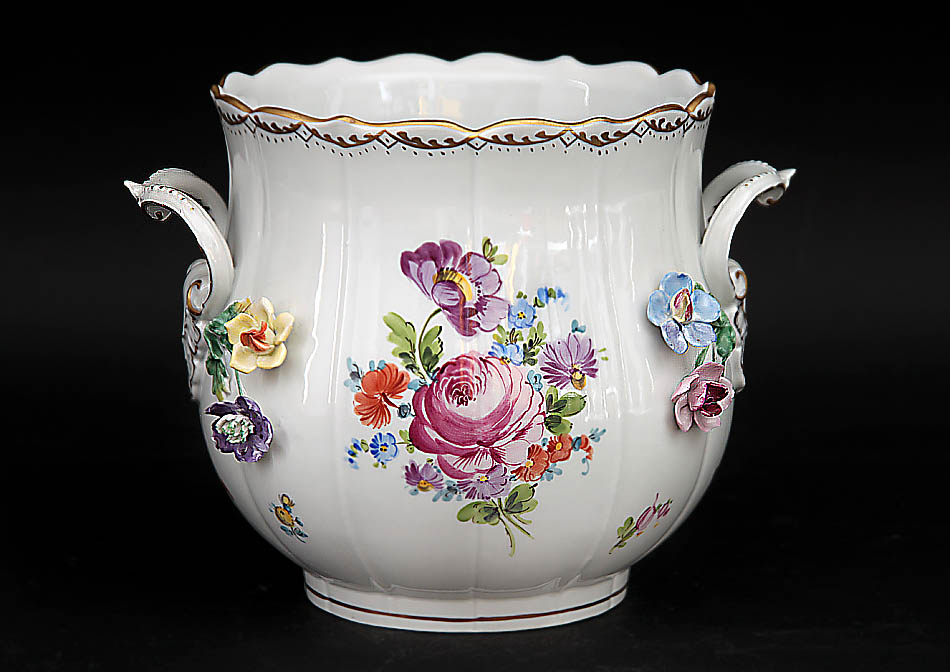 Potschappel, Manufakturstempel. Bauchiger Gefäßkörper mit zwei offenen Volutenhenkeln unten mit Blattrelief. Feine bunte Blumenbemalung, bossierte Blumen, Golddekor. H 16,6 cm, D oben 16 cm.