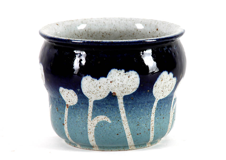 Schweden, Jackie Lynd, am Boden Manufakturstempel. Bauchiger Gefäßkörper. Hellgraue, dunkel- und hellblaue Glasur mit braunen Sprenkeln. Auf der Wandung umlaufend stilisierter Blumendekor in Hellgrau. H 12,5 cm, D oben 16 cm.