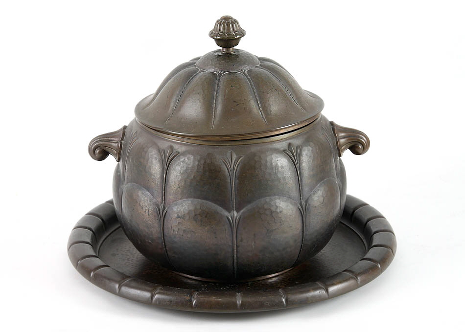 1. Drittel 20. Jh.. Brüniertes Messingblech, martelliert. Bauchiger, godronierter Topf mit Reliefdekor und zwei kleinen Reliefhandhaben. Gewölbter Deckel mit relief. Knauf. Glaseinsatz fehlt. H 34 cm. Tablett mit profiliertem Rand. D 45,5 cm. Gebrauchsspuren.