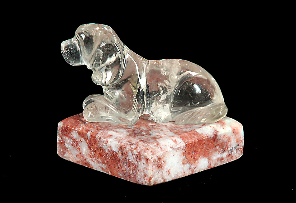 In Form eines sitzenden Hundes aus Bergkristall auf quadratischem Sockel aus Rhodochrosit. H 7,5 cm.