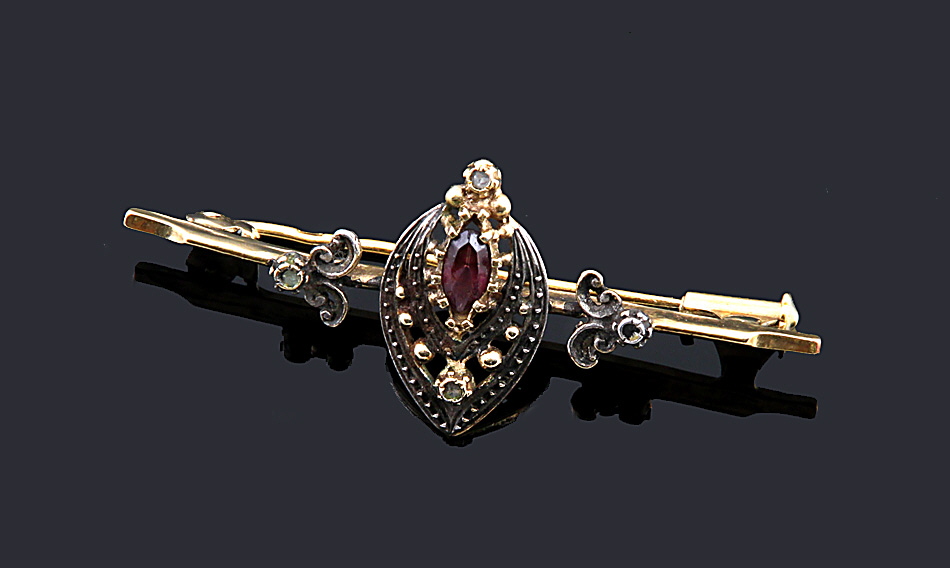 925er Silber vergoldet. Mittig ovale Applik mit Zierdurchbrüchen, Granulat und Amethystnavette. L 5,7 cm. 5,6 g brutto.