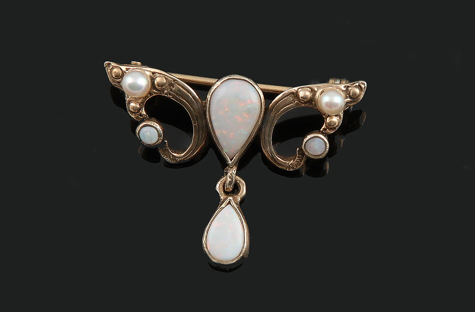 925er Silber vergoldet. Zwei kleine Süßwasserperlen, zwei weiße Opaltropfen, zwei kleine, weiße Opalcabochons. L ca. 2,7 cm. 2,4 g brutto.