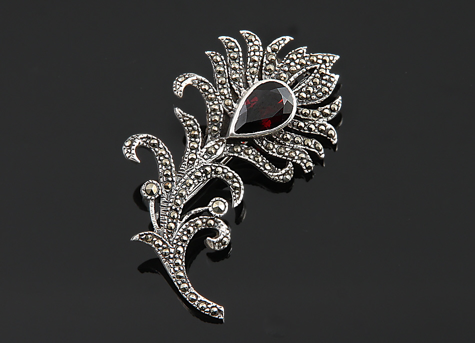 925er Silber. Form eines Blütenstengels mit Blattwerk, verziert mit einem Granattropfen und Markasiten. L 5 cm. 9,8 g brutto.