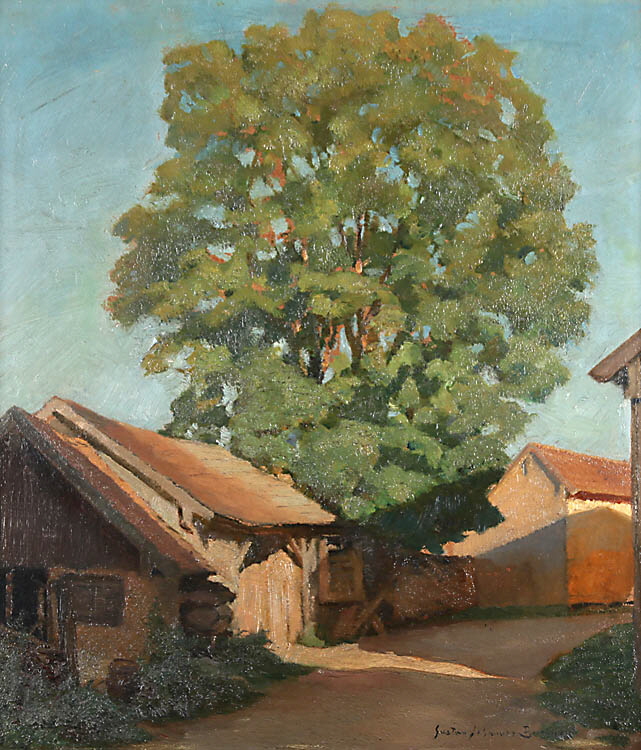 1880 München – 1951 Schliersee; deut. Landschafts- und Figurenmaler. Schüler Heinrich von Zügels. „Alte Dorfstraße“. Re. u. sign. Gustav Johann Buchner. Öl/Karton, 46 x 41 cm. R..