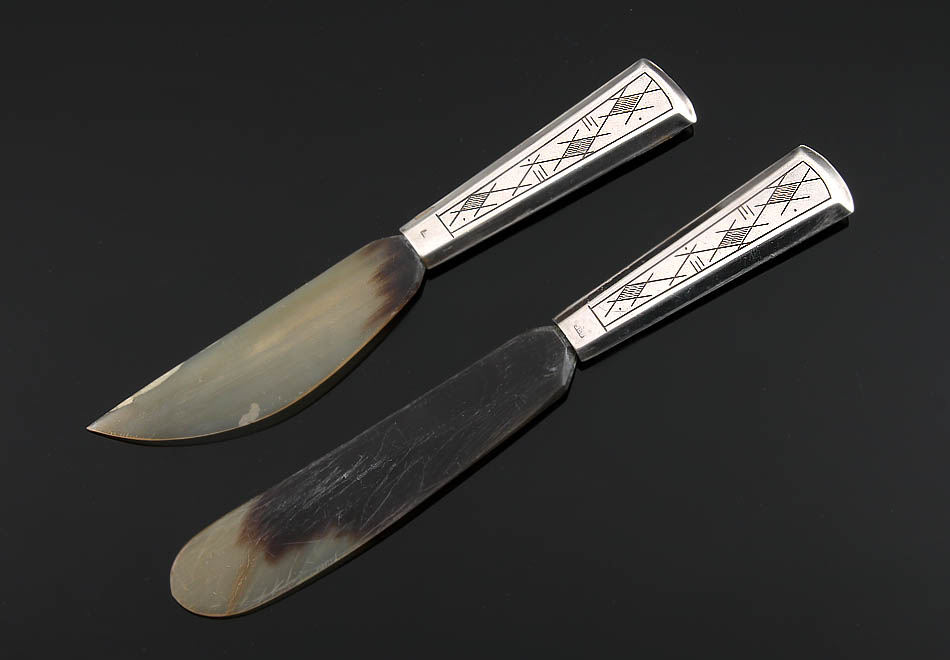 Griffe 835er Silber. Rautenmuster. Klingen Horn geschnitzt. L 16,2 cm, 14,2 cm.