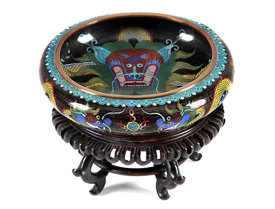 China, um 1900. Bronze. Im Spiegel Drache mit Glücksperle. Außen auf der Leibung vier Drachen und Glücksperlen. Im türkis emaillierten Boden Vierzeichenmarke: Da Ming Nian Zao. H 7,3 cm, D oben 20,5 cm. Schöner Erhaltungszustand. Dazu ein fein geschnitzter Stand aus dunkelbraun gebeiztem Holz. H 11,4 cm, D oben 18,8 cm.