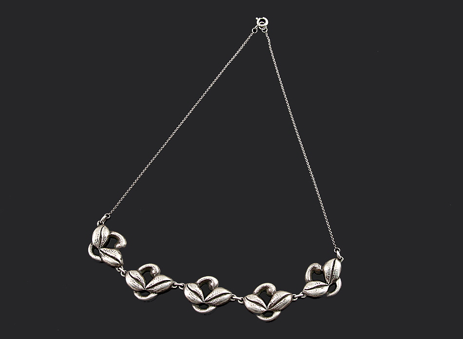 800er Silber. Fünf durchbrochene Reliefglieder. Dünne Gliederkette mit Ringösenschließe. L ca. 44,5 cm. 18,8 g.