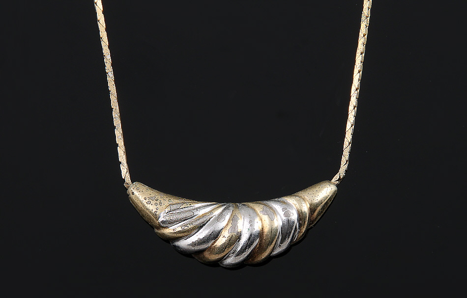 835er Silber vergoldet. Gewölbter Anhänger mit Reliefmuster. Dünne Gliederkette mit Ringösenschließe. 6,2 g.