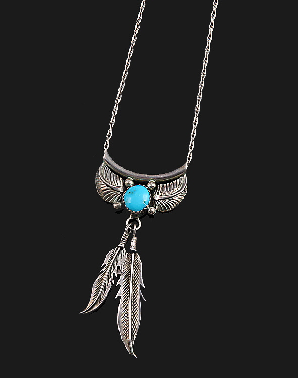 Sterlingsilber. Reliefanhänger mit Türkiscabochon. Dünne Gliederkette mit Ringösenschließe. 8,7 g brutto.