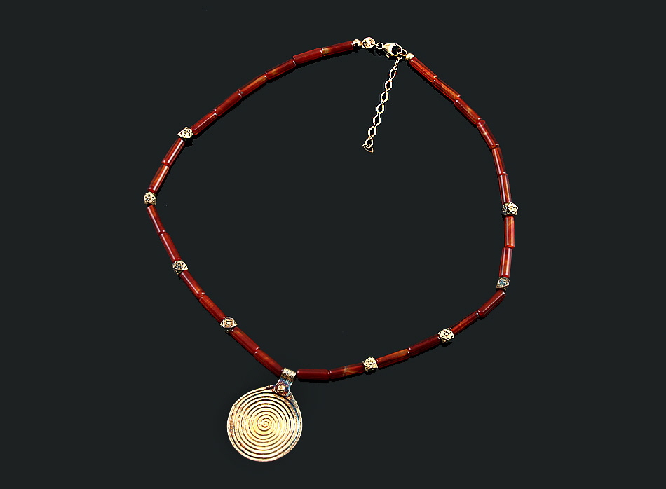 925er Silber vergoldet. Stäbchenglieder aus rotbraunem Achat, kleine, silberne Zwischenglieder, silberner, scheibenförmiger Reliefanhänger. Karabinerhakenschließe. L ca. 50 cm.