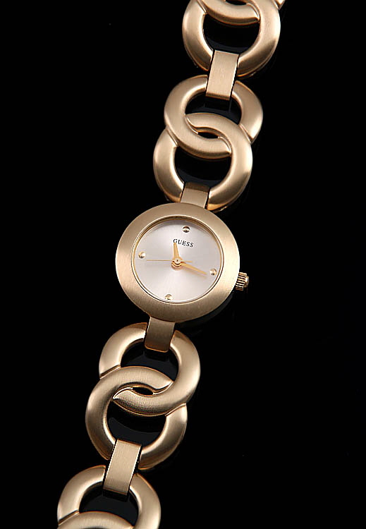 Guess. Japan. Rundes Gehäuse und Armband mattiert, vergoldet. D 24 mm. Goldene Ziffernpunkte, Goldzeiger, Zentralsek.. Quartzwerk, Funktion nicht geprüft. Neuwertiger Zustand.