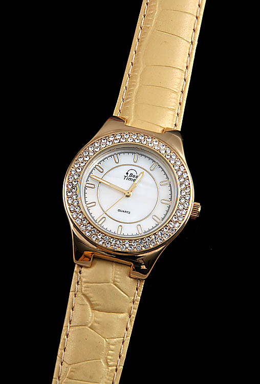 Best Times. Vergoldetes Gehäuse mit Similesteinen. D 38 mm. Zifferblatt Perlmutt, goldene Ziffernstriche, Goldzeiger, Zentralsek.. Quartzwerk, Funktion nicht geprüft. Gelbes Lederarmband mit Dornschließe. Beiliegend ein weiteres Armband aus schwarzem Leder mit Dornschließe. Neuwertiger Zustand.